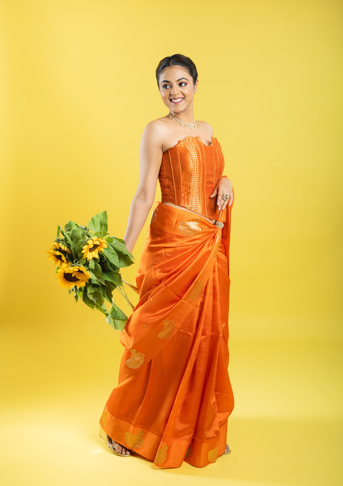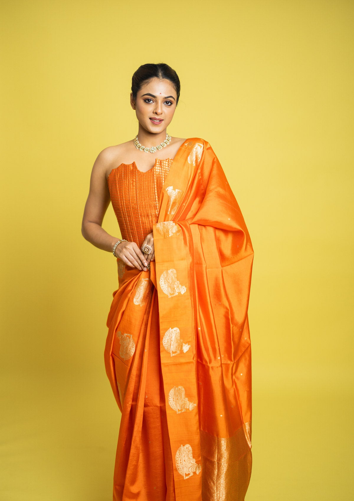 This exquisite Designer Banarasi silk saree showcases a rich orange drape, highlighted with traditional Kadhua-woven Nandi buttas along the border. Crafted in luxurious Banarasi silk, the saree reflects timeless craftsmanship while making a graceful festive statement-perfect for weddings, ceremonies, and celebratory occasions.