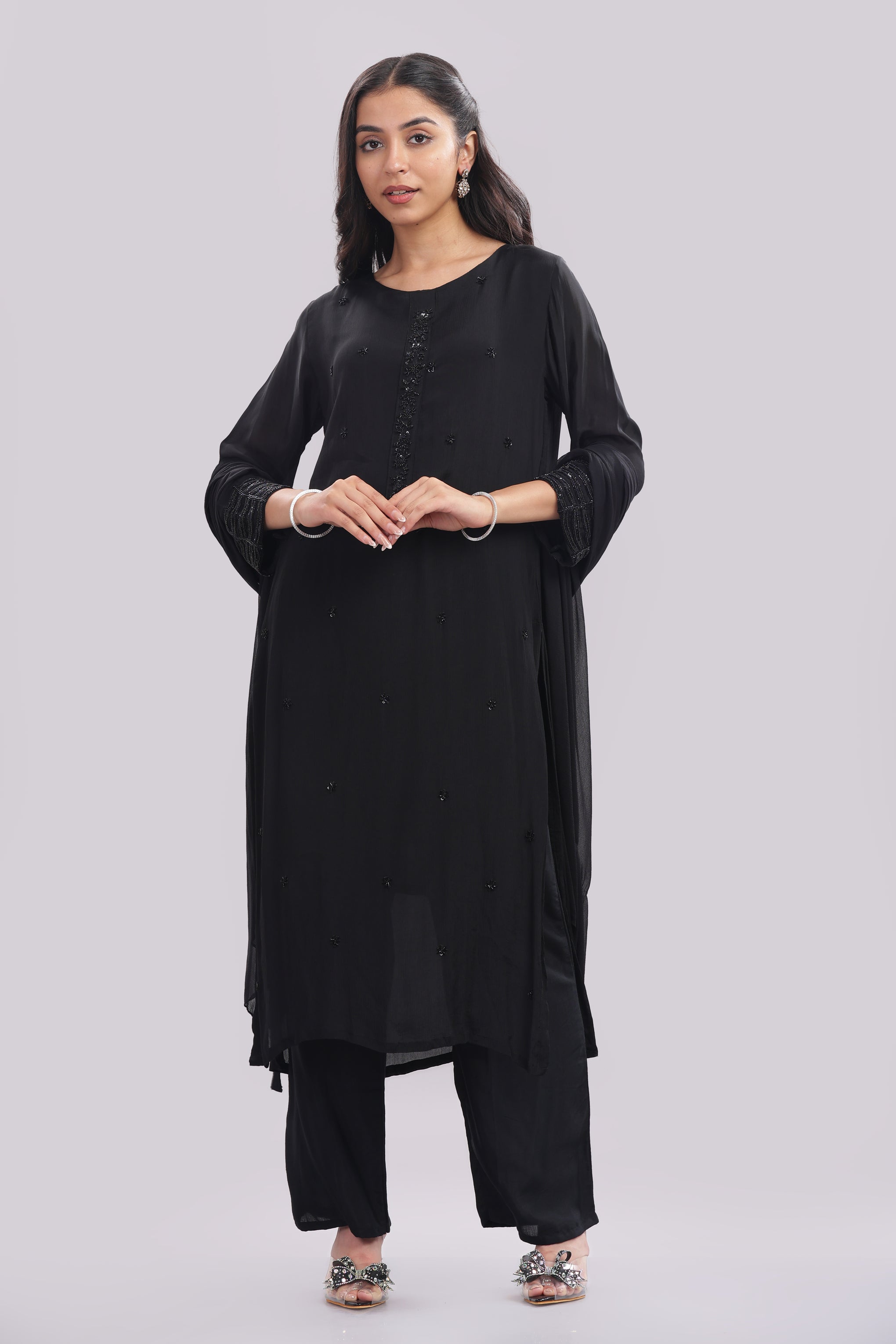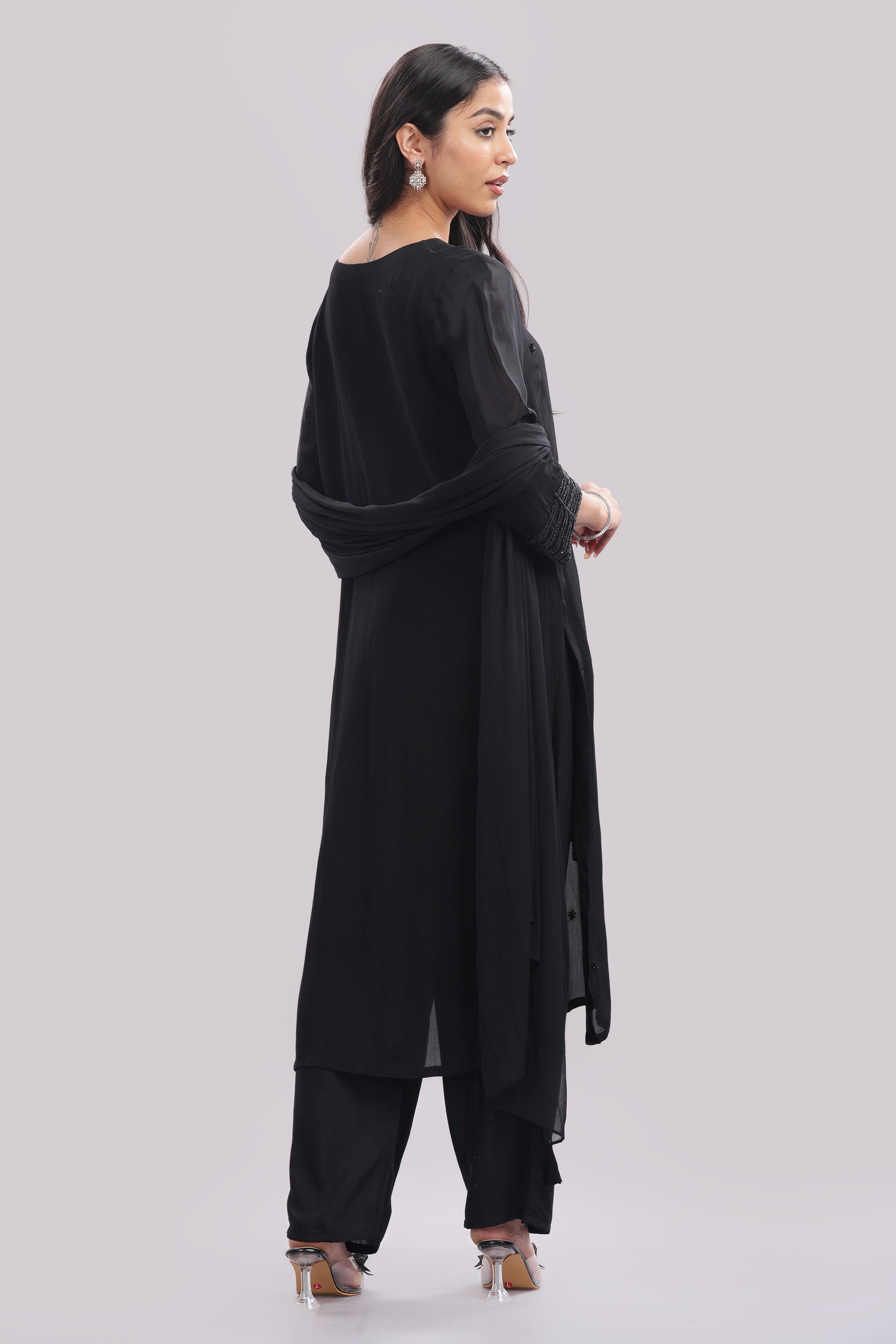 Refined yet effortlessly elegant, this designer hand-embroidered suit in classic black is a wardrobe essential. Crafted from airy chiffon, it offers graceful movement and a flattering silhouette. The subtle embroidery adds a hint of sophistication, making it perfect for festive evenings, formal gatherings, or cultural celebrations.